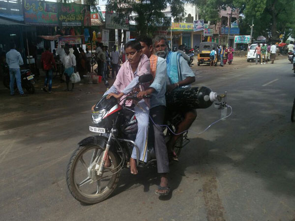 ఖమ్మం: అనివార్యమైన స్థితిలో బైక్ను ఓ కుటుంబం అంబులెన్స్గా వాడుకుంది. ఓ బాలికను కాపాడుకోవడానికి తండ్రి, తాత పడిన శ్రమ ఈ చిత్రాల్లో కనిపిస్తుంది. తాత ప్రాణాలను నిలబెట్టే ఆక్సిజన్ సిలిండర్ను పట్టుకున్నాడు. చిన్నారిని కాపాడేందుకు తండ్రి బైక్ నడిపాడు.