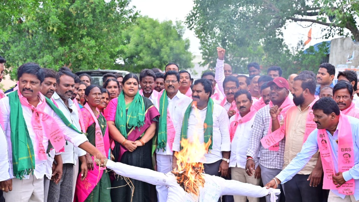 బీఆర్ఎస్ వర్సెస్ కాంగ్రెస్: ఆందోళనలు; పోటాపోటీగా దిష్టిబొమ్మల దహనాలు!!