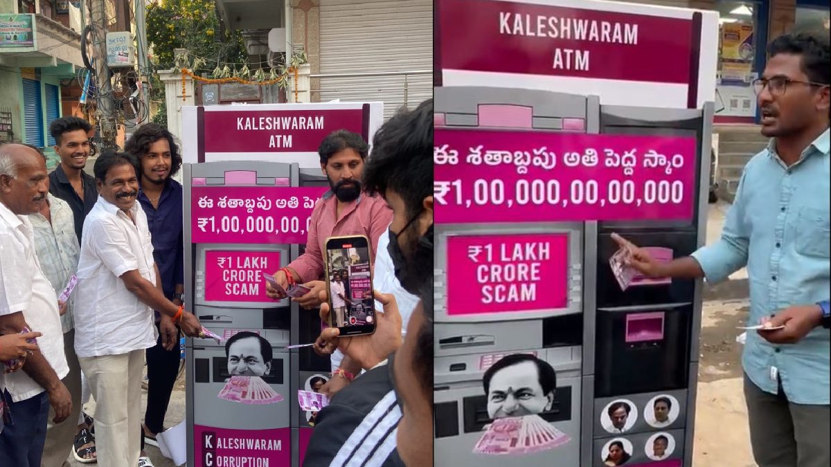 కాళేశ్వరం ఏటీఎం (Kaleshwaram ATM) పేరుతో మాక్ ఏటీఎంలను ఏర్పాటు చేసింది కాంగ్రెస్ పార్టీ. గులాబీ రంగుతో ఉన్న ఈ ఏటీఎంపై కేసీఆర్, మంత్రులు కేటీఆర్, తన్నీరు హరీష్ రావు, ఎమ్మెల్సీ కల్వకుంట్ల కవిత ఫొటోలను ముద్రించింది. కాళేశ్వరం ఏటీఎం ఈ శతాబ్దపు అతిపెద్ద స్కాం 1,00,000,00,00,000 అనే అక్షరాలు దీనిపై కనిపించాయి.