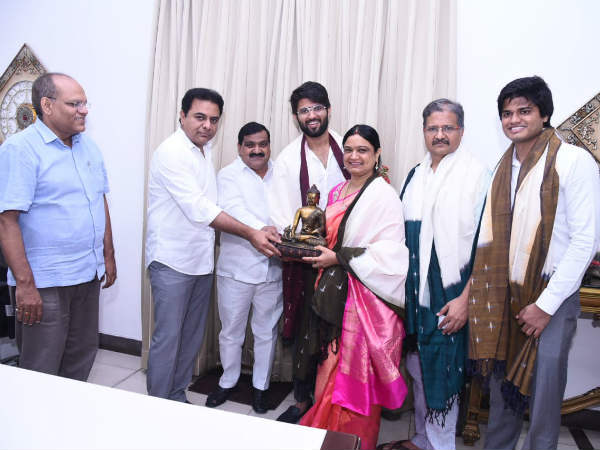శుక్రవారం విజయ్ దేవరకొండ తన కుటుంబ సభ్యులతో కలిసి తెలంగాణ మంత్రి కేటీఆర్ను కలిశారు. ఈ సందర్భంగా రూ.25లక్షల చెక్కును అందజేశారు. ఈ సందర్భంగా విజయ్ను కేటీఆర్ అభినందించడంతో పాటు ఓ మొక్క ను కానుకగా అందించారు.