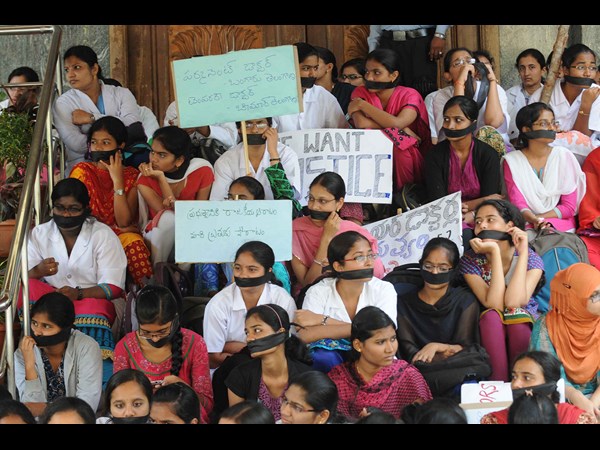 చేతులకు, నోటికి నల్ల గడ్డలు కట్టుకుని జూనియర్ డాక్టర్లు నిరసన తెలిపారు.