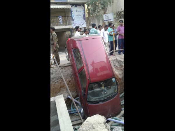వివరాల్లోకి వెళితే... కృష్ణకాంత్ పార్క్ వైపు నుండి మధురానగర్-యూసఫ్ గూడరోడ్డు వైపు రామకృష్ణ అనే వ్యక్తి ఆదివారం ఉదయం తన మిత్రుడిని తన కారులో దిగబెట్టి వస్తున్నాడు. అయితే అదుపుతప్పి ప్రమాదవశాత్తూ అక్కడే గుంతలోకి కారు దూసుకుపోయింది.