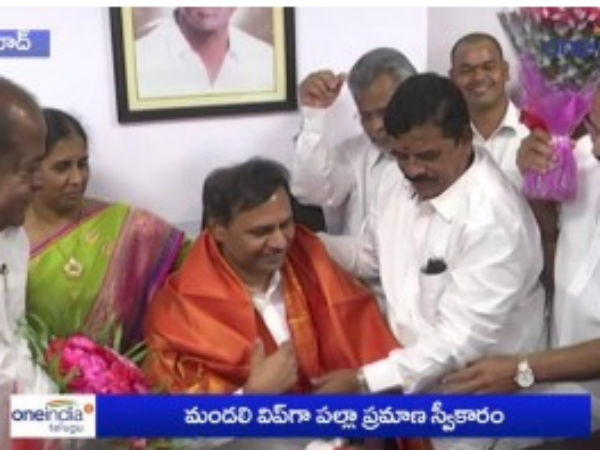 హైదరాబాద్: తెలంగాణ శాసనమండలి విప్గా ఎమ్మెల్సీ పల్లా రాజేశ్వర్రెడ్డి శుక్రవారం బాధ్యతలు స్వీకరించారు. ఈ కార్యక్రమానికి రాష్ట్ర రోడ్లు భవనాల శాఖ మంత్రి తుమ్మల నాగేశ్వరరావు, శాసనమండలి చైర్మన్ స్వామిగౌడ్, పలువురు ఎమ్మెల్యేలు, ఎమ్మెల్సీలు హాజరయ్యారు. పల్లా శాసనమండలి విప్గా పదవీ బాధ్యతలు స్వీకరించిన అనంతరం ముఖ్యమంత్రి కేసీఆర్ను క్యాంపు కార్యాలయంలో కలిసి కృతజ్ఞతలు తెలియజేశారు.
