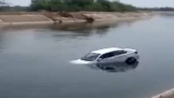 నాగార్జున సాగర్ ఎడమ కాలువలో కొట్టుకుపోతున్న హోండా సిటీ కారు: తోసేసిన ఇద్దరు!