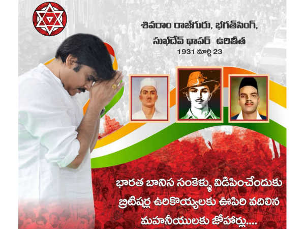 భవిష్యత్ తరాల కోసం, జనం కష్టాల పట్ల స్పృహతో, వారి సంక్షేమం కోసం స్వతంత్రమైన ఆలోచనలతో స్పష్టమైన ప్రణాళిక కలిగి ఉండాలి. మేధావి అని సాధికారికంగా భగత్ సింగ్ ని పిలిచేందుకు అన్ని అర్హతలూ ఉన్నాయి. భగత్ సింగ్, రాజ్ గురు, సుఖ్ దేవ్ లు చేసిన ఆత్మార్పణను ఆంధ్ర ప్రదేశ్, తెలంగాణలోని యువత ఈ రోజు స్మరించుకుంది. ఆర్థికంగా మెరుగైన పరిస్థితుల్ని తీసుకురావడంలో రెండు ప్రభుత్వాలూ విఫలం కావడంపై వారి స్పూర్తితో పోరాడుతుంది. నిస్వార్థంగా, సాహసోపేతమైన ఆ ముగ్గురి త్యాగాలను స్మరించుకొంటూ జనసేన సెల్యూట్ చేస్తోంది. జై హింద్' అని ఆ ప్రకటనలో పేర్కొన్నారు.