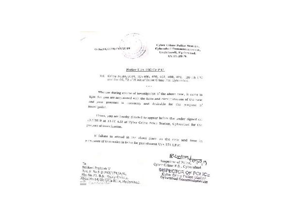 హైదరాబాద్ : టీవీ 9 ఛానెల్ నిర్వహణకు సంబంధించి కొన్ని పత్రాలు కనిపించడం లేదని, మరికొన్ని ఫోర్జరీకి గురయ్యాయని అలంద మీడియా కార్యదర్శి కౌశిక్ రావు ఇచ్చిన ఫిర్యాదు మేరకు రవిప్రకాశ్, సినీనటుడు శివాజీ, టీవీ 9 ఫైనాన్స్ మూర్తికి పోలీసులు నోటీసులు జారీచేశారు. శుక్రవారం ఉదయం 11 గంటలలోపు విచారణకు హాజరుకావాలని నోటీసుల్లో గచ్చిబౌలి సైబర్ క్రైం పోలీసులు పేర్కొన్నారు.