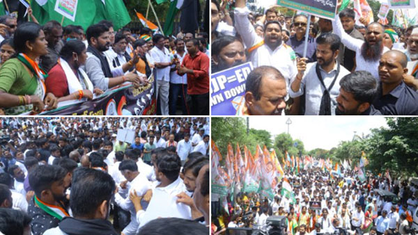 సోమవారం ఉదయం నెక్లెస్ రోడ్డులోని ఇందిరాగాంధీ విగ్రహం నుంచి ప్రారంభమైన కాంగ్రెస్ నేతల ర్యాలీ బషీర్బాగ్ ఈడీ కార్యాలయానికి చేరుకుంది. అక్కడే ఈడీ కార్యాలయం ముందు కాంగ్రెస్ నేతలు రోడ్డుపైనే బైఠాయించి కేంద్ర ప్రభుత్వానికి వ్యతిరేకంగా నినాదాలు చేశారు. భారీ ఎత్తున కాంగ్రెస్ నేతలు రోడ్డపై బైఠాయించడంతో కిలోమీటర్ల మేర ట్రాఫిక్ స్తంభించింది.