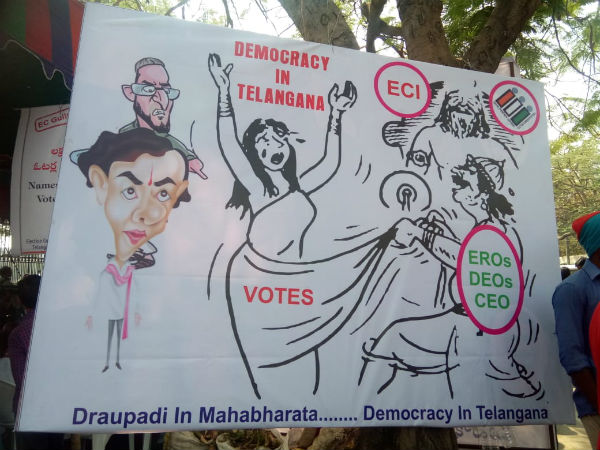 అసెంబ్లీ ఎన్నికల నిర్వహణలో అక్రమాలు జరిగాయంటూ.. హైదరాబాద్ లోని ఇందిరాపార్క్ ధర్నాచౌక్ దగ్గర ఆందోళనకు దిగారు కాంగ్రెస్ నేతలు. కేంద్ర ఎన్నికల సంఘం పూర్తిగా వైఫల్యం చెందిందని ఆరోపిస్తూ నిరసన చేపట్టారు. అయితే అసెంబ్లీ ఎన్నికలను అపహాస్యం చేశారంటూ మహాభారతంలోని ద్రౌపది వస్త్రాపహారణతో పోల్చుతూ ఫ్లెక్సీ కట్టారు. "మహాభారతంలో ద్రౌపది.. తెలంగాణలో ప్రజాస్వామ్యం" అనే టైటిల్ పెట్టారు. ఓట్లను ద్రౌపదితో పోల్చుతూ.. ERO, DRO, CEO లను దుశ్శాసనుడి కింద లెక్కగట్టారు. కేంద్ర ఎన్నికల సంఘం అధికారులను ధృతరాష్ట్రుడిగా చిత్రీకరించారు. సీఎం కేసీఆర్ తో పాటు ఎంఐఎం అధినేత అసదుద్దీన్ ఒవైసీ ల కార్టూన్ ఫోటోలను కూడా చేర్చారు. అందరూ కలిసి ప్రజాస్వామ్యాన్ని ఖూనీ చేసినట్లుగా ఫ్లెక్సీని రూపొందించారు.