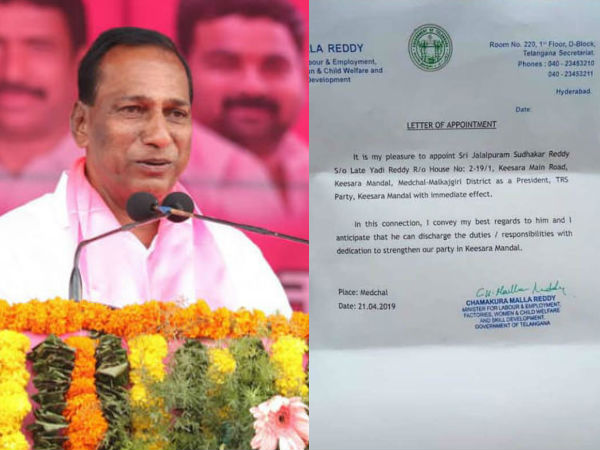 మల్లారెడ్డి అధికారిక లెటర్ హెడ్ మీద పార్టీ పదవి ఉత్తర్వులు ఇచ్చినట్టు చెప్తున్న లెటర్ సోషల్ మీడియాలో వైరల్