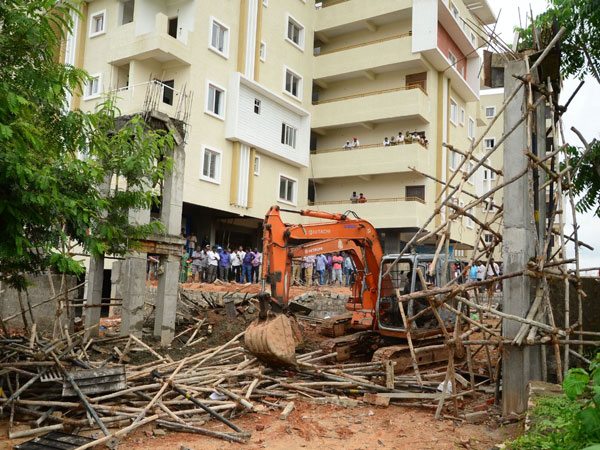 నాలుగున్నర ఎకరాల్లో 14 బ్లాకులు, స్టిల్ట్, సెల్లార్, ఐదు అంతస్తులతో కూడిన 540 ఫ్లాట్ల డిజైన్కు మాత్రమే అనుమతి ఉందని, ప్రహరీ కూడా ప్లాన్లో చూపించలేదని చెబుతున్నారు. సంఘటనా స్థలాన్ని పరిశీలించిన అధికారులు.. 15 అడుగుల ఎత్తులో 25 అడుగుల వెడల్పుతో కమాను నిర్మాణం చేపట్టారని, ఇరువైపులా నాలుగు పిల్లర్లు వేసినా వాటిపై వేసిన రెండు బీమ్ల నిర్మాణం ప్రమాదానికి కారణమైందని చెప్పారు.