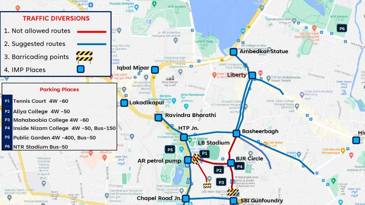 ట్రాఫిక్ ఆంక్షలతో వాహనాలు దారి మళ్లించడం ద్వారా రవీంద్రభారతి, ట్రాఫిక్ పోలీస్ కంట్రోల్ కాంప్లెక్స్, బషీర్ బాగ్, ఎస్బీఐ గన్పౌండ్రి, అబిడ్స్ సర్కిల్, లిబర్టీ సర్కిల్, హిమాయత్ నగర్, అసెంబ్లీ, ఎంజే మార్కెట్ కూడళ్ల వద్ద వాహనాలు పెద్ద ఎత్తున బారులు తీరే అవకాశం ఉందని ట్రాఫిక్ పోలీసులు తెలిపారు. ఈ క్రమంలో నగరవాసులు ఎల్బీ స్టేడియానికి వచ్చే మార్గాల్లో కాకుండా ప్రత్యామ్నాయదారులు ఎంచుకోవాలని సూచించారు. ఏదైనా అసౌకర్యం ఏర్పడితే హెల్ లైన్ నెంబర్లకు ఫోన్ చేయాలన్నారు.