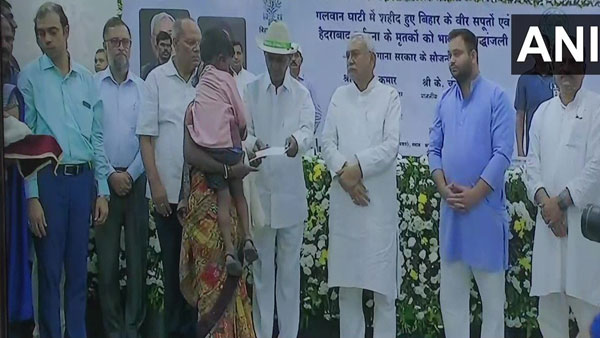 పాట్నా: దేశ సేవలో అమరులైన సైనికుల కుటుంబాలను ఆదుకోవడం మనందరి బాధ్యత అని తెలంగాణ ముఖ్యమంత్రి కేసీఆర్ అన్నారు. భారత్-చైనా సరిహద్దు గాల్వాన్ ఘర్షణలో అమరులైన 10 మంది బీహార్ సైనికులకు బీహార్ సీఎం నితీష్ కుమార్తో కలిసి సీఎం కేసీఆర్ రూ. 10 లక్షల చొప్పున ఆర్థిక సాయం అందించారు.
