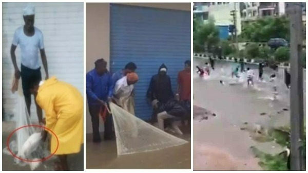 With lakes and streams full and water spilling on to roads due to heavy rains, locals who noticed fish run to catch some in #Nirmal#TelanganaRains pic.twitter.com/Siap04exxn