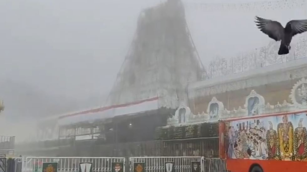 #WATCH | Andhra Pradesh | Tirumala temple engulfed in fog this morning pic.twitter.com/G6yfkziN8X