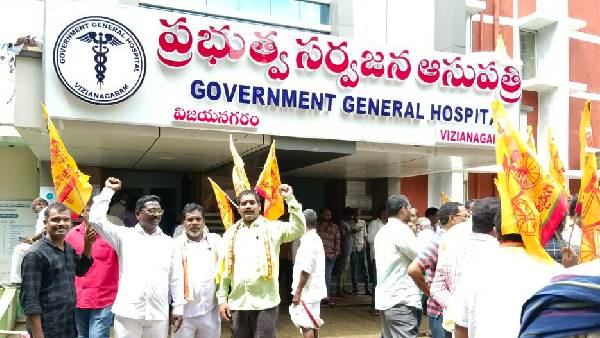 ఆస్పత్రికి మహారాజా ఆస్పత్రి పేరునే కొనసాగించాలని టీడీపీ నేతలు, కార్యకర్తలు ఆస్పత్రి వద్దకు చేరుకుని ఆందోళన చేపట్టారు. ప్రజలకు ఎంతో సేవ చేసిన మహారాజా రాజవంశాన్ని అవమానించేలా వైసీపీ ప్రభుత్వం చర్యలు ఉన్నాయని మండిపడ్డారు. కాగా, ఇటీవల ఎన్టీఆర్ హెల్త్ యూనివర్సిటీ పేరును వైయస్సార్ హెల్త్ యూనివర్సిటీగా మార్చడంపై పెద్ద ఎత్తున ఆందోళనలు జరిగిన విషయం తెలిసిందే. టీడీపీతోపాటు ఇతర పార్టీలు, నేతలు కూడా ప్రభుత్వ నిర్ణయాన్ని తప్పుబట్టారు. అయితే, వైసీపీ సర్కారు మాత్రం తమ నిర్ణయం సరైనదేనని సమర్థించుకుంది. ఈ వివాదం సద్దుమణుతున్న సమయంలో తాజాగా, మహారాజా ఆస్పత్రి పేరు మార్పు చర్చకు దారితీసింది.
