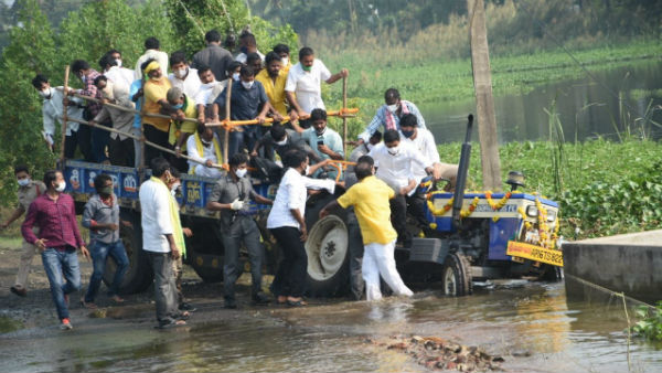 పశ్చిమగోదావరి జిల్లాలోని ఆకివీడు మండలం సిద్ధాపురం వద్ద నిన్న టీడీపీ ఎమ్మెల్సీ నారా లోకేష్ ఇతర టీడీపీ నేతలతో కలిసి పర్యటించారు. ఈ సందర్భంగా ఆయన ట్రాక్టర్లో పలువురు టీడీపీ కార్యకర్తలను ఎక్కించుకుని హుషారుగా టూర్ చేస్తున్నారు. మధ్యలో బురదలో ట్రాక్టర్ ఇరుక్కుపోవడంతో జనం భయభ్రాంతులకు గురయ్యారు. అక్కడే ఉన్న ఉండి టీడీపీ ఎమ్మెల్యే మంతెన రామరాజు వెంటనే జోక్యం చేసుకుని ట్రాక్టర్ను అదుపు చేశారు. వెంటనే లోకేష్ను కిందికి దింపి అక్కడికి నుంచి తీసుకెళ్లారు. లోకేష్కు పెను ప్రమాదం తప్పడంతో టీడీపీ శ్రేణులు ఊపిరి పీల్చుకున్నాయి.