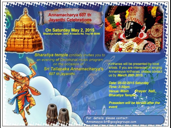 మిచిగాన్: మే 2వ తేదిన, అన్నమాచార్య 607వ జయంతి పండుగని భారతీయ టెంపుల్ ట్రాయ్ ఘనంగా జరిపింది. ప్రధాన అర్చకులైన బ్రహ్మా శ్రీ జానకి రామ శాస్త్రి స్వయానా అందరికి అ భయం ఇచ్చు అ దేవ దేవునికి పాటతోఅన్నమాచార్యుల వారికీ మొదటగా ప్రార్ధన చేసారు.