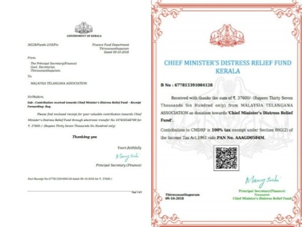 అతలాకుతలమైన కేరళకు ఎంతోమంది తమవంతుగా సహాయ సహకారాలు అందిస్తున్నారు. ఇందులో భాగంగా మలేసియాలోని తెలంగాణవాసులు కూడా తమ వంతుగా కొంత మొత్తాన్ని ముఖ్యమంత్రి సహాయ నిధికి అందించారు.