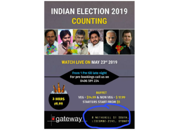 ఆస్ట్రేలియాలో 'గేట్ వే‘ పేరుతో సిడ్నీలో ఈవెంట్ నిర్వహిస్తున్నారు. 'ఇండియన్ ఎలక్షన్ 2019 కౌంటింగ్‘ పేరుతో నిర్వహించే కార్యక్రమంలో పెద్ద పెద్ద ఎల్ఈడీ తెరలు పెట్టి ఎప్పటికప్పుడు వారికి లైవ్ అప్డేట్స్ అందిస్తారు. ప్రత్యేకంగా ముద్రించిన కార్డులో కేసీఆర్, పవన్ కల్యాణ్, చంద్రబాబు నాయుడు, జగన్ మోహన్ రెడ్డి, నరేంద్ర మోదీ, రాహుల్ గాంధీ ఫోటోలను ముద్రించారు. ఇందుకోసం వారి వారి పేర్లను నమోదు చేసుకోవాలని 0406 591 234 అనే నంబర్ కూడా ఇచ్చింది. అంతేకాదు చిన్న సైజు మెను కూడా సిద్ధం చేసింది. ఇందులో 3 బీర్లకు 10 డాలర్లు, వెజ్ బఫెట్కు 15 డాలర్లు, నాన్ వెజ్ బఫెట్కు 18 డాలర్లు చార్జీ చేస్తామని తమ ముద్రించిన కార్డులో పేర్కొంది.