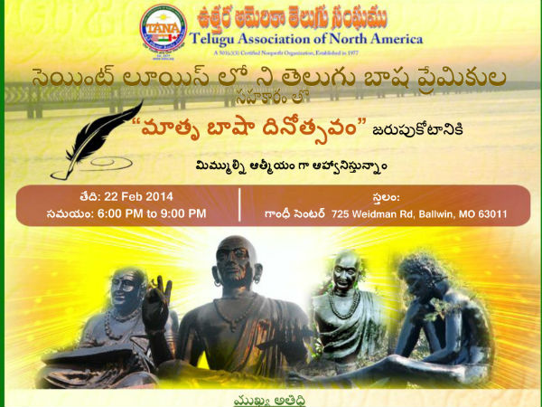 ఈ వేడుకలను మాతృ భాష దినోత్సవం పేరిట తొలిసారిగా గాంధీ సెంటర్లో నిర్వహిస్తున్నారు. ప్రముఖ తెలుగు భాషావేత్త, సంగీత అధ్యాపకుడు వెల్చేరు నారాయణ రావు ఈ కార్యక్రమానికి ముఖ్య అతిథిగా హాజరవుతారని నిర్వాహకులు తెలిపారు. వెల్చేరు నారాయణ రావు భారత సాహిత్యంపై యూనివర్సిటీ ఆఫ్ విస్కన్సిన్-మిడిసన్, యూనివర్సిటీ ఆఫ్ చికాగోలో గత 38 ఏళ్లుగా అధ్యయనం చేస్తున్నారు.