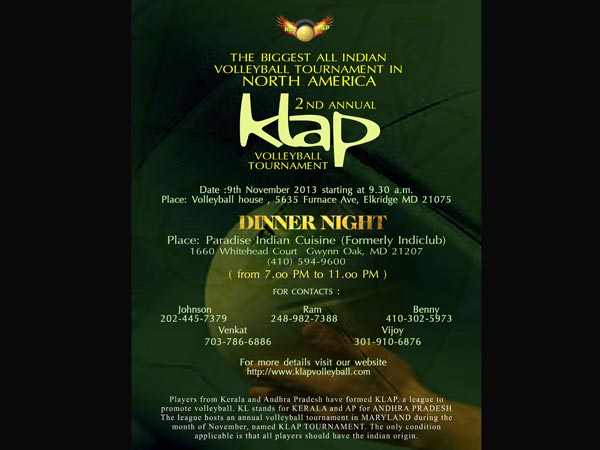 ఉత్తర అమెరికాలో నవంబర్ 9న రెండో వార్షిక క్లాప్ వాలీబాల్ టోర్నమెంట్ 2013ను నిర్వహిస్తున్నట్లు తెలిపారు. ఉదయం 9గంటల నుంచి సాయంత్రం 6గంటల వరకు టోర్నమెంట్ జరుగుతుందని వారు తెలిపారు. ఈ టోర్నమెంట్ మేరీలాండ్లోని బల్టిమోర్ వాలీబాల్ హౌజ్లో నిర్వహిస్తున్నట్లు చెప్పారు. వాలీబాల్ టోర్నమెంట్లో పాల్గొనే ఉత్సాహవంతులు అక్టోబర్ 30లోపు తమ పేరును నమోదు చేసుకోవాలని కోరారు.