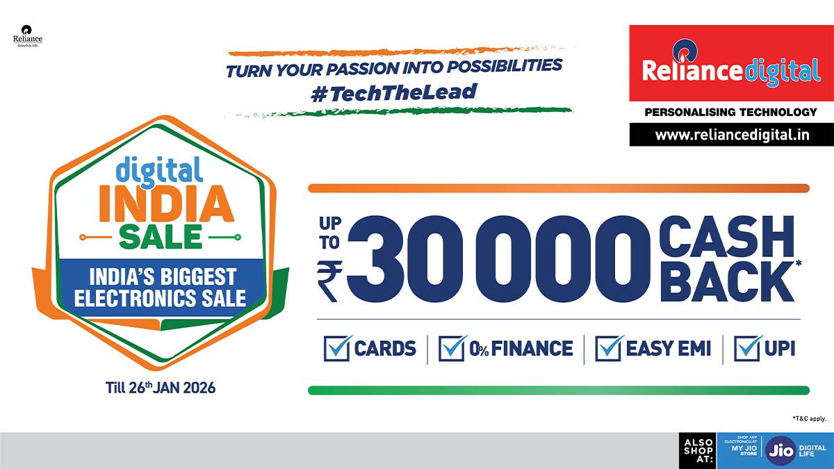 గణతంత్ర దినోత్సవ స్ఫూర్తితో సంబరాలు జరుపుతున్న భారతదేశపు అగ్రగామి ఎలక్ట్రానిక్స్ రిటెయిలర్, ఆధునిక టెక్నాలజీతో 17 నుండి 26 జనవరి 2026 వరకు, రిలయన్స్ డిజిటల్ ఇండియా సేల్లో ఇళ్ళను మరియు జీవనశైలిలను అప్గ్రేడ్ చేసుకోవలసిందిగా షాపర్లను ఆహ్వానిస్తోంది. కన్సూమర్ డ్యూరబుల్ లోన్స్పై రూ. 26,000 ఇన్స్టంట్ బ్యాంక్ డిస్కౌంట్తో మీ పొదుపులు గరిష్టం చేసుకోండి లేదా రూ. 30,000 వరకు క్యాష్బ్యాక్ పొందండి- ప్రతి అప్గ్రేడ్ని సులభతరం మరియు ఎక్కువ సరసంగా చేస్తోంది. హెచ్డి టీవీల నుండి స్మార్ట్ ఉపకరణాల వరకు, డిజిటల్ ఇండియా సేల్ ప్రతి ఒక్కరికీ ఏదో ఒకటి అందిస్తోంది.