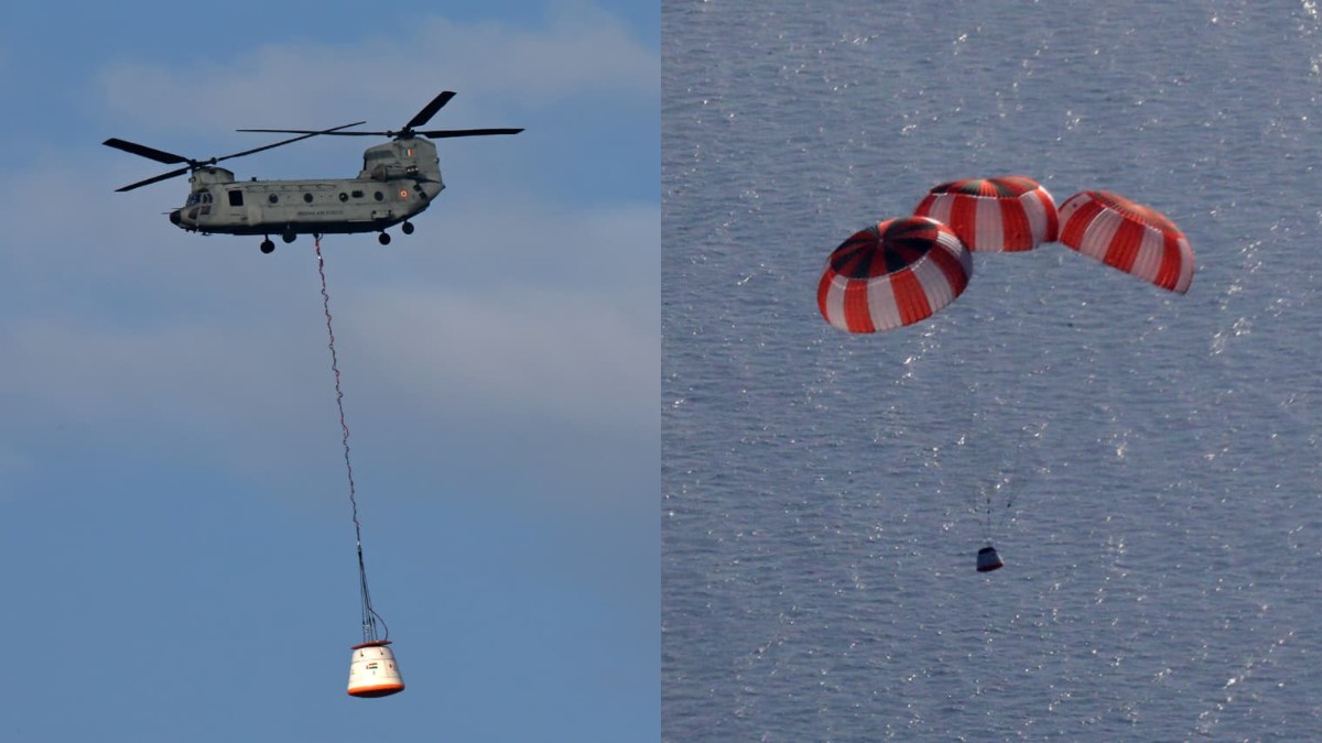ఈ క్రమంలో గగన్ యాన్ మిషన్ లో మరో ముందడుగు వేసింది ఇస్రో. గగన్యాన్ క్రూ మాడ్యూల్ కోసం రూపొందించిన పారాచూట్ ఆధారిత డీసెల్లరేషన్ సిస్టమ్ పనితీరును నిర్ధారించే తొలి ఇంటిగ్రేటెడ్ ఎయిర్-డ్రాప్ టెస్ట్ (IADT-01)ను విజయవంతంగా నిర్వహించింది.