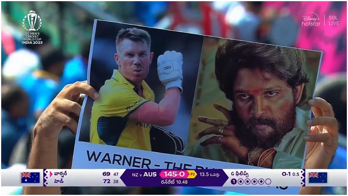 ఒకవంక వార్నర్ జోరు కొనసాగుతున్న సమయంలో ధర్మశాల స్టేడియంలో స్టైలిష్ స్టార్ అల్లు అర్జున్ ప్లకార్డ్ కనిపించడం ఆకట్టుకుంది. పుష్ప- ది రైజ్ పార్ట్ 1లో తగ్గేదే లేదనే స్టిల్లో కనిపించింది అల్లు అర్జున్ బొమ్మ. అదే ప్లకార్డ్పై డేవిడ్ వార్నర్ ఫొటోనూ పేస్ట్ చేశారు ఫ్యాన్స్. అల్లు అర్జున్- డేవిడ్ వార్నర్ మ్యూచువల్ ఫ్యాన్స్ స్టేడియంలో సందడి చేశారు.