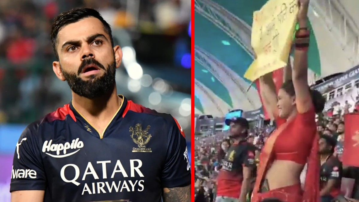 मैच के समय स्टेडियम में आई हुई एक महिला पोस्टर पे लिख कर दिखाती है कि RCB अगर फाइनल नही जीती तो मैं अपने पति को तलाक दे दूंगी