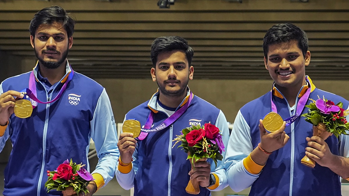 రజత పతకంతో మహిళల రైఫిల్ టీమ్..:మహిళల 10 మీటర్ల ఎయిర్ రైఫిల్ టీమ్ ఈవెంట్లో రమిత జిందాల్, మెహులీ ఘోష్, ఆషి చోక్సీలతో కూడిన జట్టు రజత పతకం సాధించింది. 1886 పాయింట్ల స్కోరుతో రెండో స్థానానికి పరిమితమైంది. ఇక ఇప్పుడు పురుషుల ఈవెంట్లో ఏకంగా వరల్డ్ రికార్డుతో గోల్డ్ గెలవడం ఇండియా గర్వించదగ్గ విషయం. క్వాలిఫికేషన్ రౌండ్లో రమిత 631.9, మెహులీ 630.8, చోక్సీ 623.3 పాయింట్లు స్కోరు చేసి, ఓవరాల్గా రెండో స్థానంతో పతకం దక్కించుకున్నారు. 1896.60 పాయింట్లతో స్వర్ణం నెగ్గిన చైనా టీమ్. మంగోలియా కాంస్యం దక్కించుకొంది.