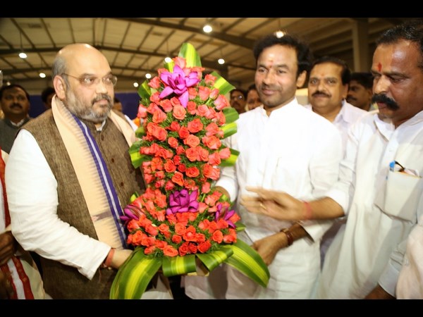 అమిత్ షాకు కేంద్ర మంత్రి బండారు దత్తాత్రేయ, పార్టీ రాష్ట్ర అధ్యక్షుడు జి కిషన్రెడ్డి, సీనియర్ నేత, సినీ నటుడు కృష్ణంరాజు, వందలాది మంది నాయకులు,, కార్యకర్తలు ఘనస్వాగతం పలికారు. భారీ ర్యాలీతో అమిత్షా పర్యాటక భవన్కు చేరుకున్నారు.