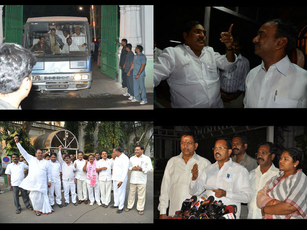 గురువారం అసెంబ్లీ జనవరి 3వ తేదీ వరకు నిరవధిక వాయిదా పడటంతో తెలంగాణ ప్రాంత సభ్యులు అసెంబ్లీలోనే బైఠాయించారు. అరెస్టు అనంతరం మాట్లాడుకుంటున్న టిటిడిపి ఎమ్మెల్యే ఎర్రబెల్లి, తెరాస ఎమ్మెల్యే ఈటెల