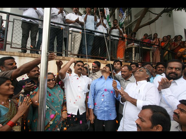 హైదరాబాదులోని వైయస్సార్ కాంగ్రెస్ పార్టీ కేంద్ర కార్యాలయంలో శనివారం నాడు నవంబర్ 1 వేడుకలు నిర్వహించారు. ఈ సందర్భంగా జెండా ఎగురవేస్తున్న జగన్.